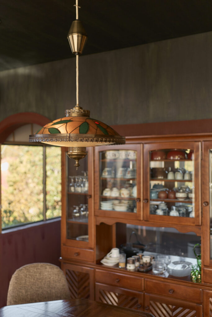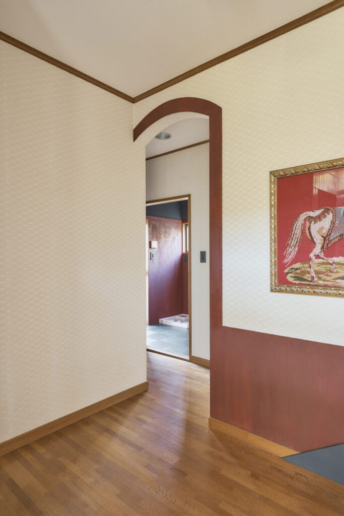 既存のインテリアから見出したキーワードは、小さなクラシック。光沢ある丸い模様が複製するクロスや、アーチ状の出入り口、またシンプルというよりは装飾性のある照明器具や家具が印象的でした。