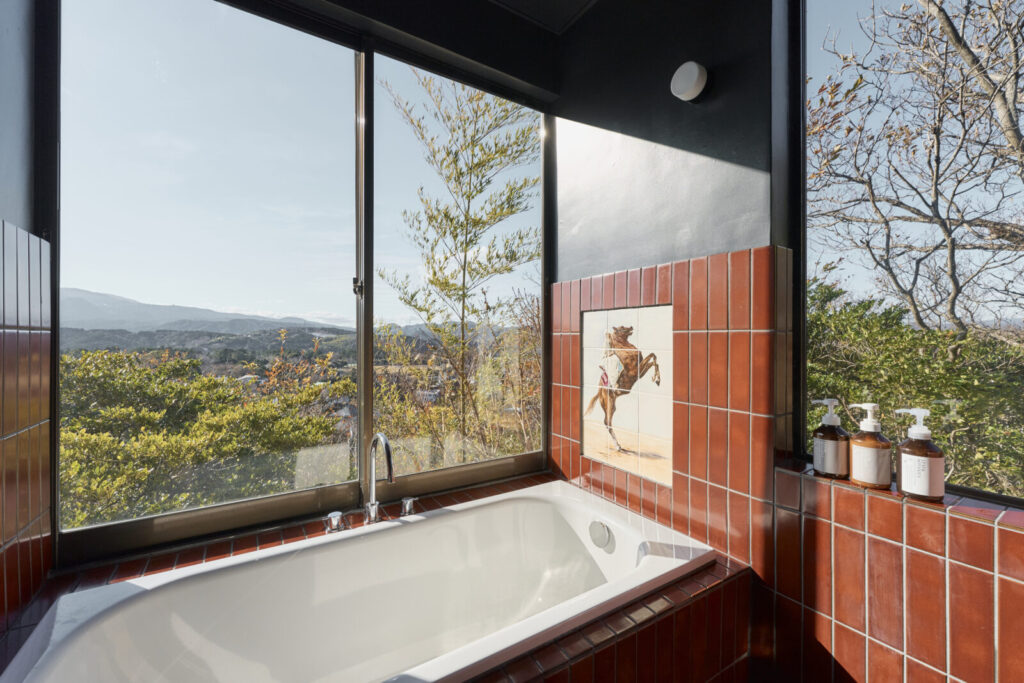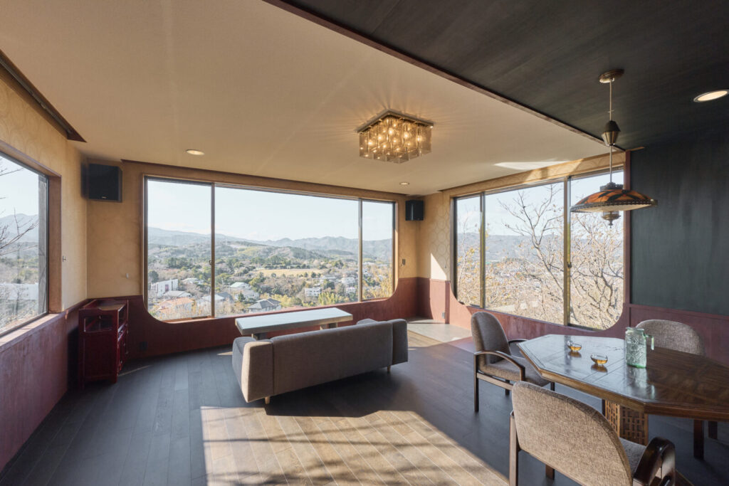 2階リビングからは伊豆半島内陸を望む大きな窓が設けられていましたが、3方向サイズが異なる状態で、環境的な感動体験が分散していました。一連したパノラマ状の広がりとして捉えられるよう、腰下に重心を据える褐色帯をまわしています。