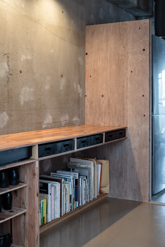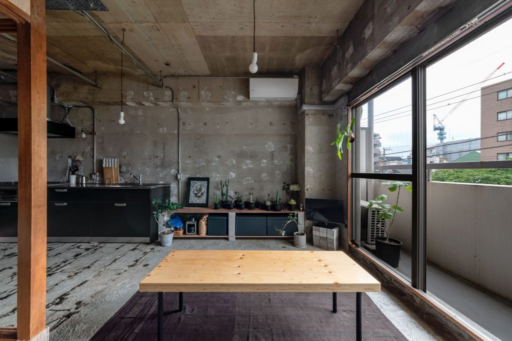 一般的な2DK賃貸マンションに、L型のスケルトン土間を挿入するように潔く解体。アトリエのような印象となった土間空間には、玄関、キッチン、リビングが内包されている。