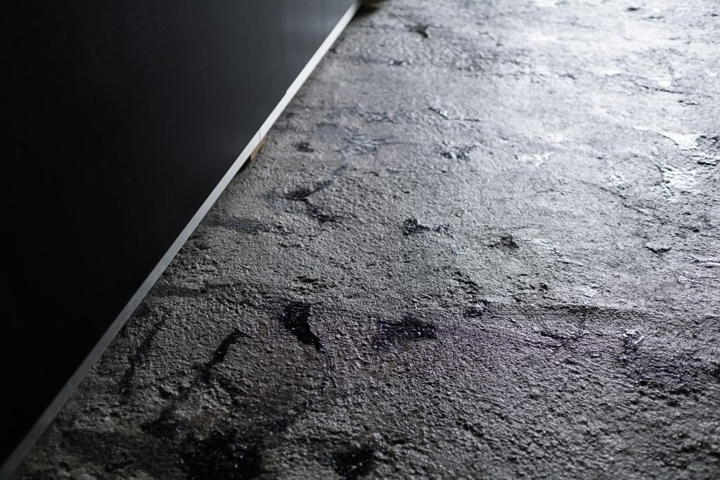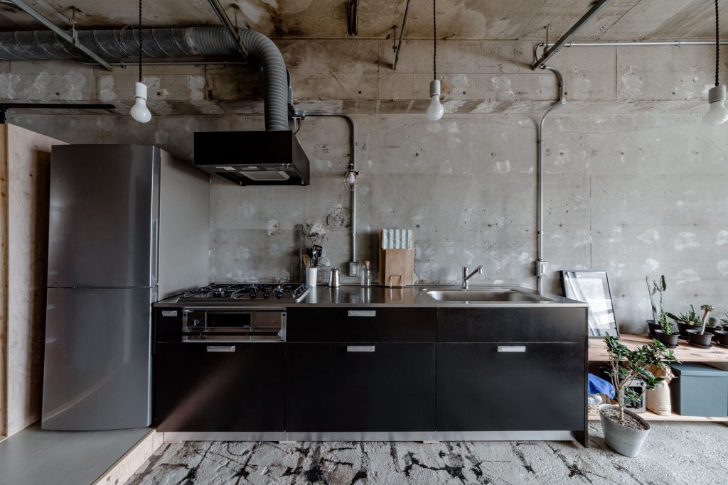 張り替えようと思っていた既存の襖は、ソファと相性が良かったためそのまま残すことにして、床解体で現れたボンドの黒い跡がちょっとアートみたいでかっこいいので、それに合わせてキッチンは黒い艶ありに。