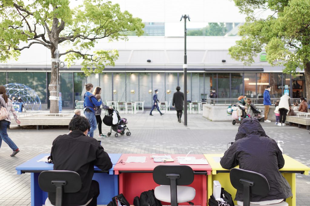コロナ渦にあって在宅ワークも加速した昨今、ワーカーの利用が減少したこのエリア。新たに「外で働く」という新しい文化をつくりだし、人の流入に繋げたい考えだ。通り道である中央通路に沿って、歩くと次第に多様な働く風景が見えてくるようショーケースやワークデスクを左右に分散させ、既存の公園ベンチでくつろぐ親子の居場所と共存できるよう配置した。