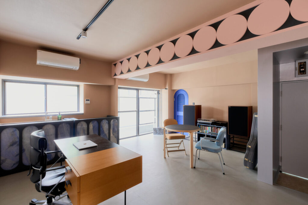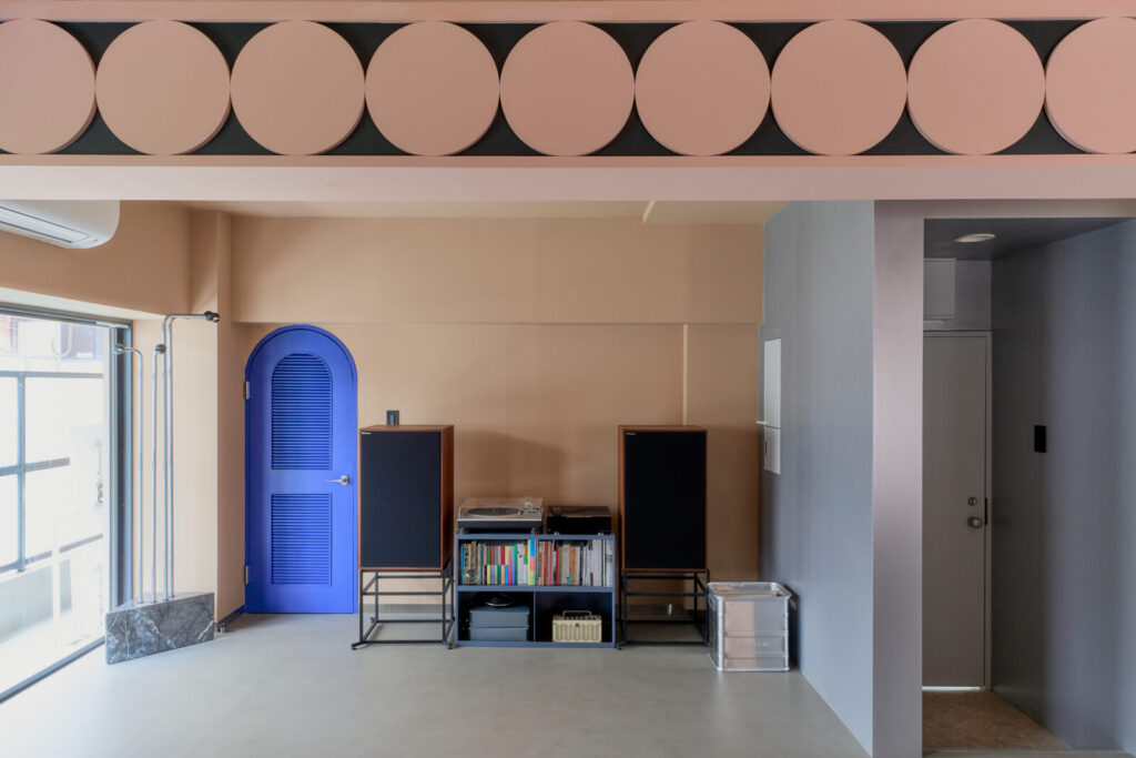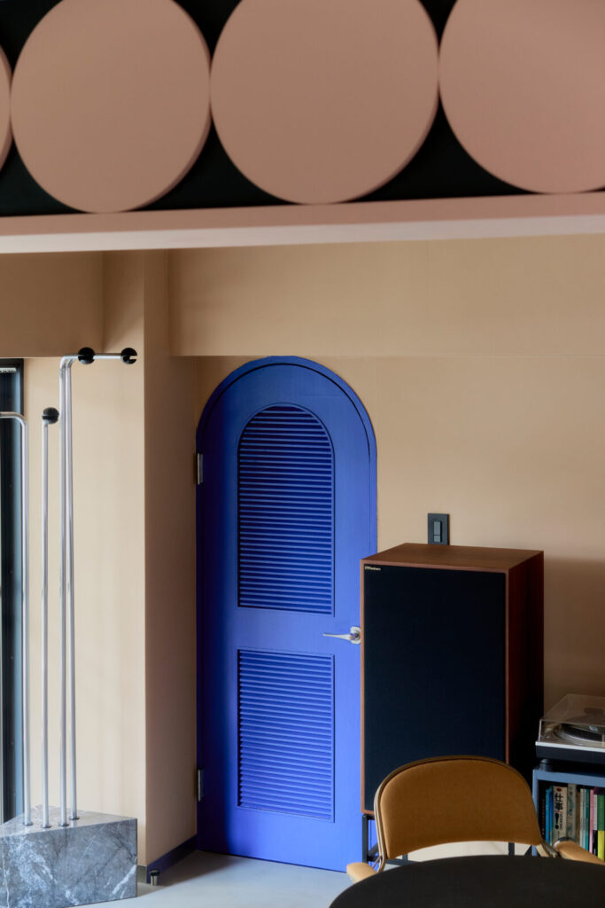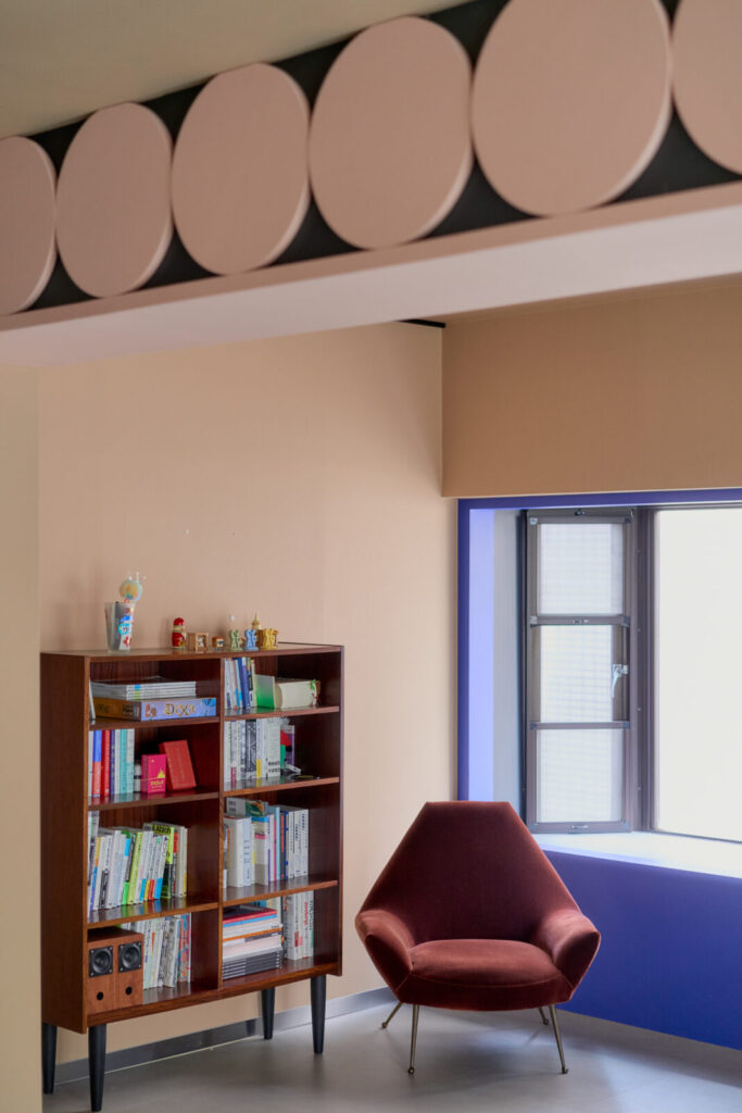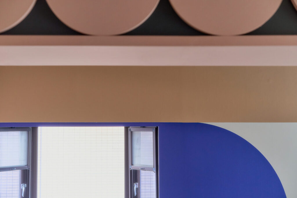 既存の出窓をチャームポイントに変えるため円形のブルーパネルを配置したり、トイレへの扉もブルーとして扉の向こう側を想像する仕掛けとしました。既存の梁は、構造物から装飾的なインテリアに捉え直すよう、円が連続する模様を施しています。