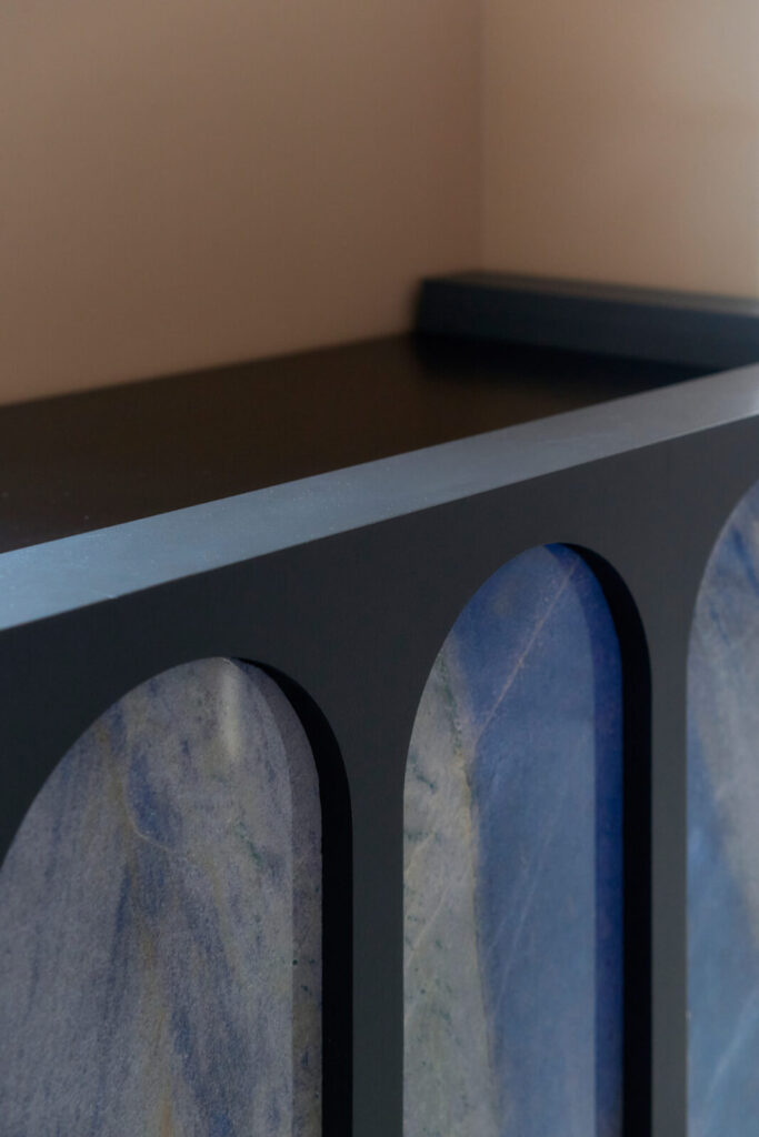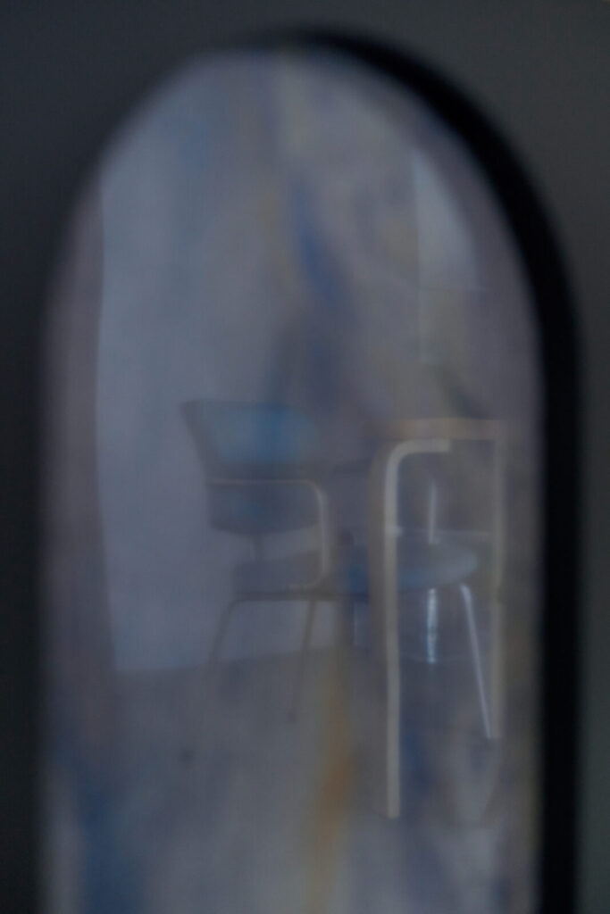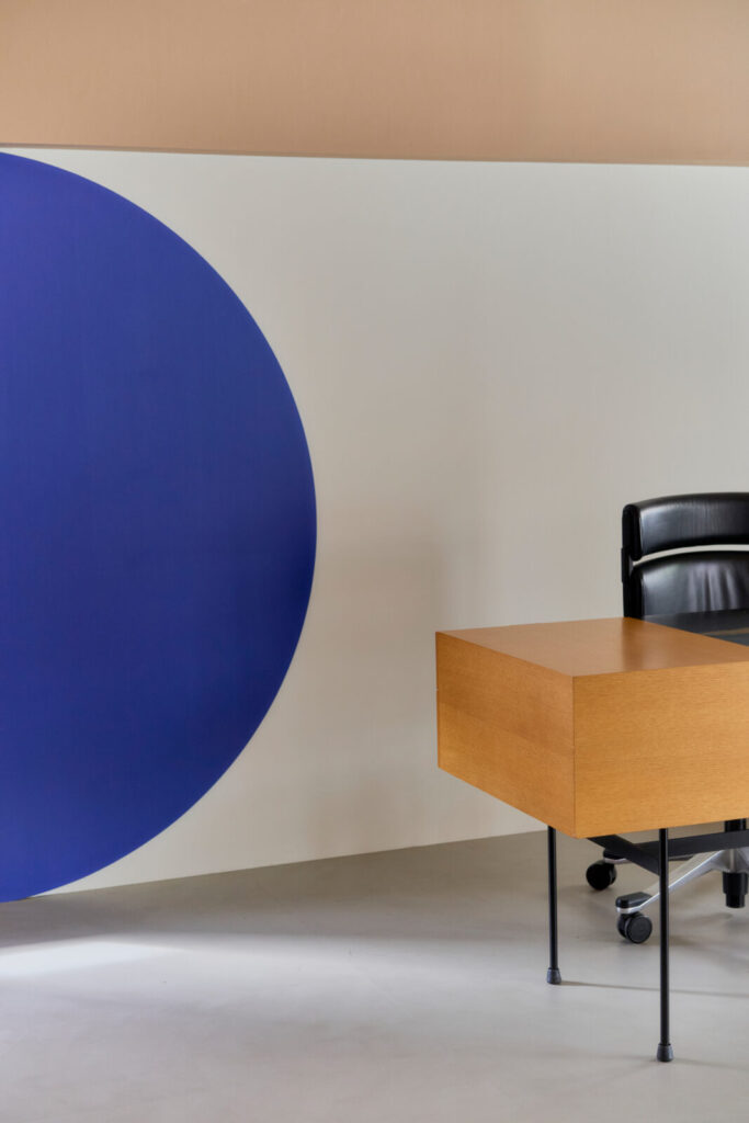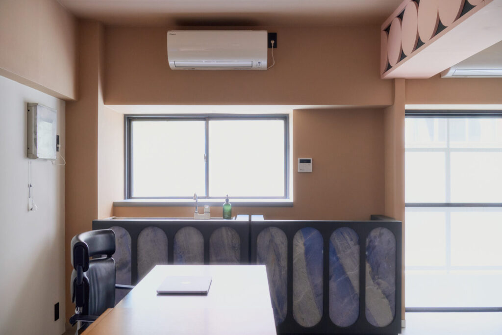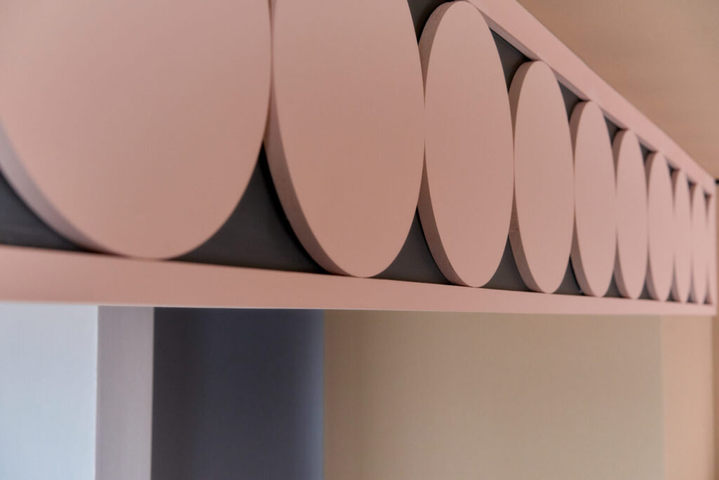 既存の出窓をチャームポイントに変えるため円形のブルーパネルを配置したり、トイレへの扉もブルーとして扉の向こう側を想像する仕掛けとしました。既存の梁は、構造物から装飾的なインテリアに捉え直すよう、円が連続する模様を施しています。
